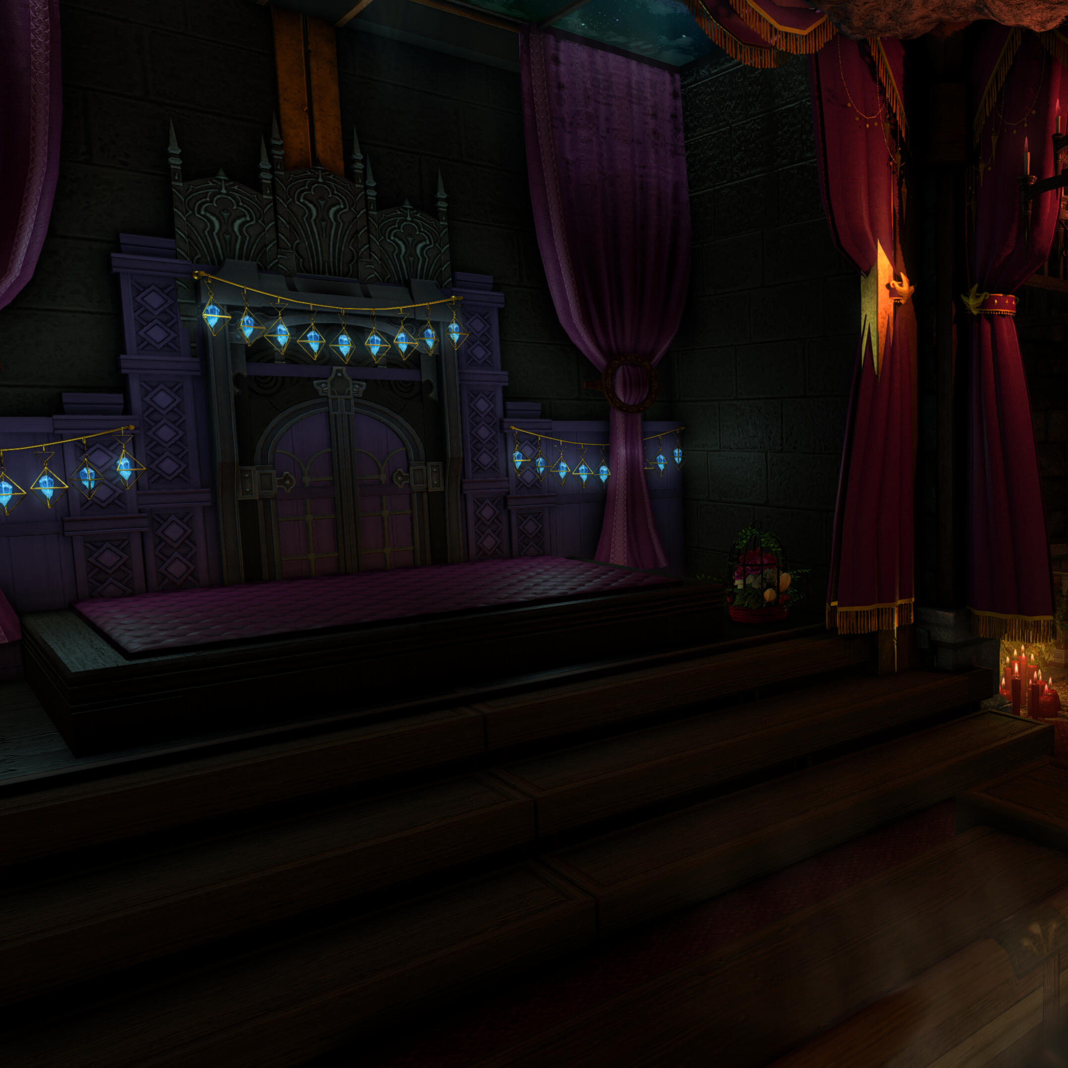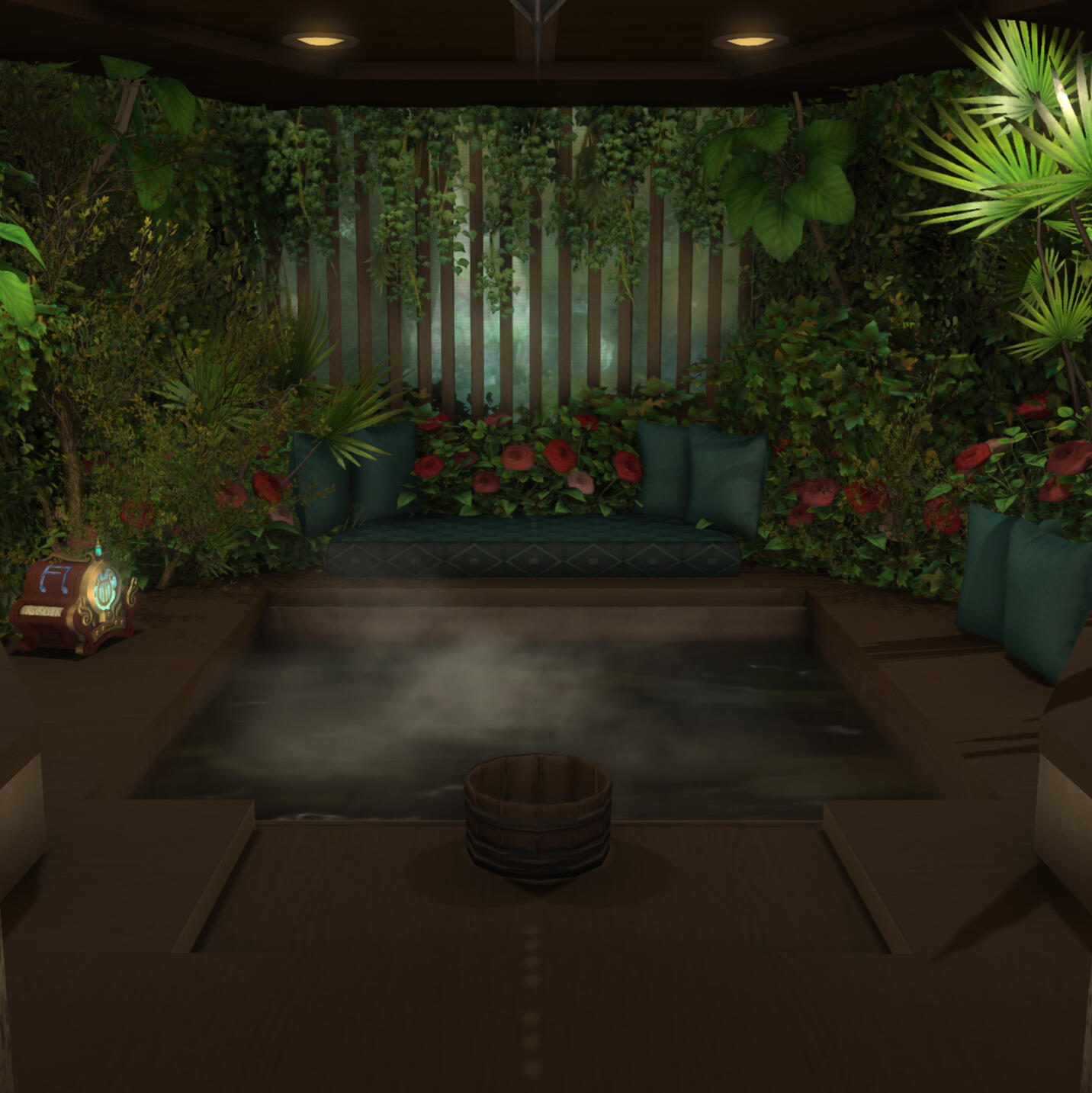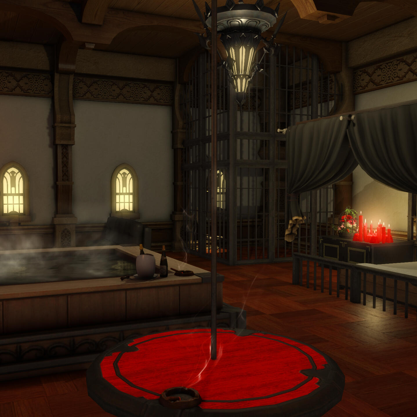 Thank you for visiting Chalet Nocturne, a secluded evening cabin for your Warrior of Light. Change into something comfortable or nothing at all before submerging yourself into our onsens to warm up your blood. Relax further with a massage from a master masseuse. Take a look around and you might find some more pleasurable options...